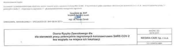 Ocena ryzyka zawodowego przeprowadzona dla stanowiska pracy potencjalnie zagrożonych koronawirusem Sars-COV-2 bez względu na miejsce ich lokalizacji w firmie Care Personel Sp. z o.o., Sp. k., ul. Nowy Świat 54/56, 00-363 Warszawa.