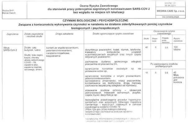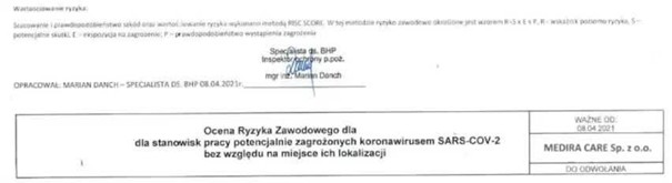 Ocena ryzyka zawodowego przeprowadzona dla stanowiska pracy potencjalnie zagrożonych koronawirusem Sars-COV-2 bez względu na miejsce ich lokalizacji w firmie Care Personel Sp. z o.o., Sp. k., ul. Nowy Świat 54/56, 00-363 Warszawa.