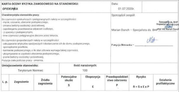 Ocena ryzyka zawodowego przeprowadzona na stanowiskach pracy w firmie Care Personel Sp. z o.o., Sp. k., ul. Nowy Świat 54/56, 00-363 Warszawa